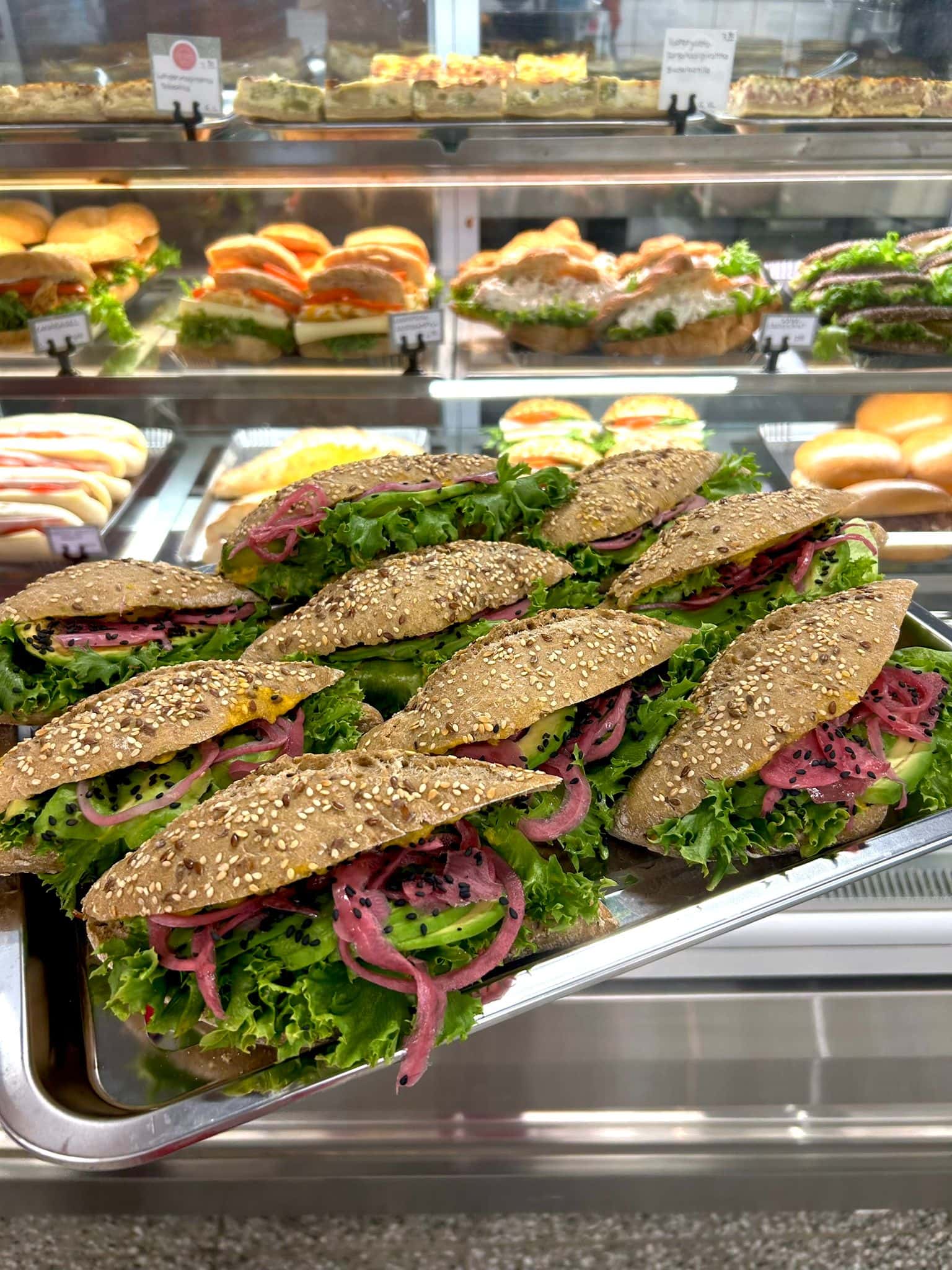 Vitriinistä löytyy myös houkutteleva valikoima itse tehtyjä suolaisia herkkuja – mm. täytettyjä croissanteja, panineja, sämpylöitä ja piirakoita.